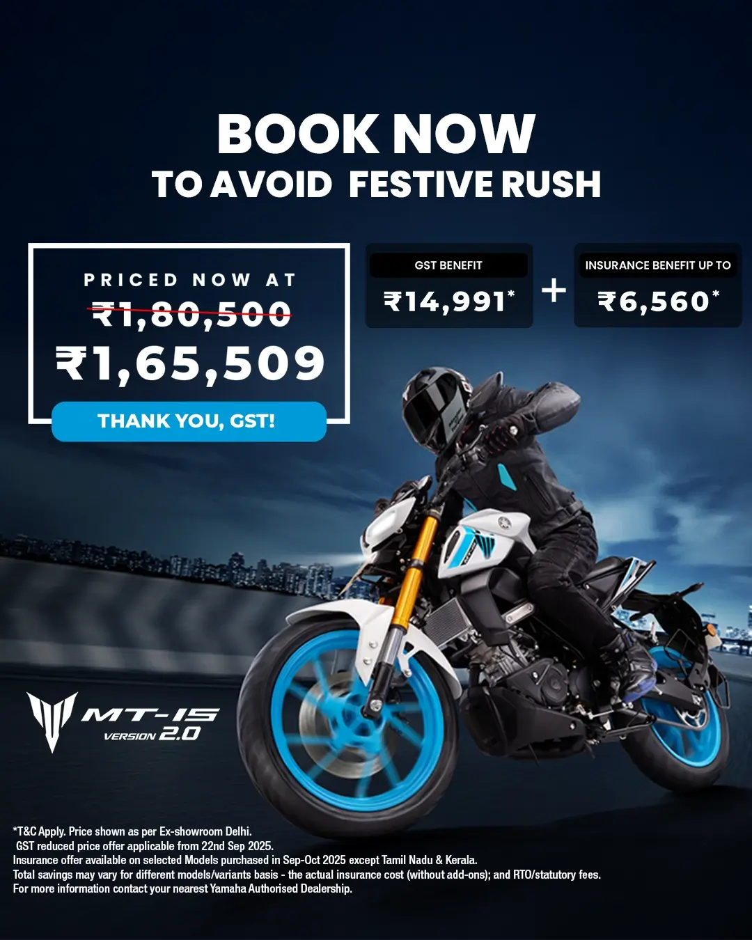 Carrying the legacy of MT series, the new MT-15 Ver 2.0 brings more aggression and agility with its Upside Down front forks, Aluminium Swingarm, 155cc LC 4V FI engine and other exciting features. Stay connected with your Dark Warrior through Y-Connect even on the move.