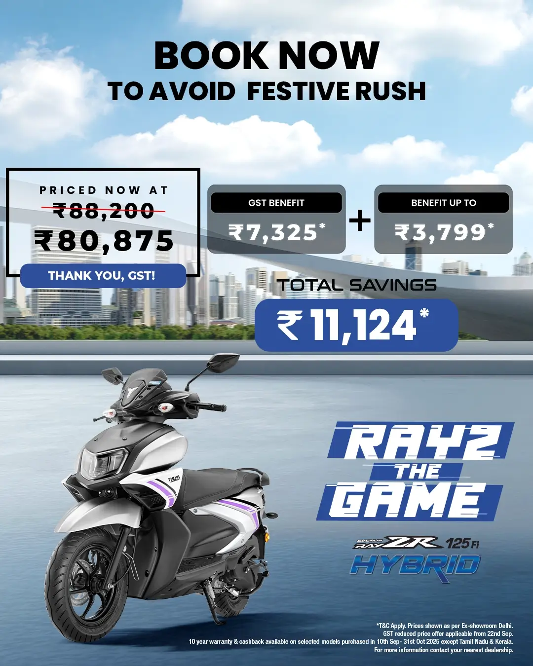 RayZR 125 Fi is built on the concept of “Armoured Energy”. A sturdy built design and weight that’s at 99Kgs makes your ride agile and quick. The “Motorcycle-Scooter Evolution” design from Yamaha is also reflected in the sporty and sharp characters of the Street Rally. The new metal plate addition on the body enhances overall stylish character.